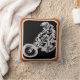 Une descente en VTT et cavalier. La moto est dessinée en gris, utilisant la technique "espace blanc" sur un arrière - plan noir. Le coureur descend sur la colline et se voit donner une perspective par la roue avant de la moto en regardant plus grand (plus près) que l'arrière.