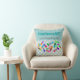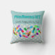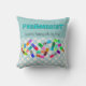 Le coussin drôle de pharmacien "compte les pilules heureuses par cinq", les capsules colorées dessinées par artiste avec les visages souriants sur un point de polka bleu-clair et l'arrière - plan bleu. Grand cadeau d'obtention du diplôme de PharmD.