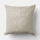 Elégant coussin d'accent carré pour les couples heureux et les jeunes mariés dispose d'un script blanc M. et Mme design avec un texte monogramme personnalisé qui peut être personnalisé avec le nom de famille marié. La couleur arrière - plan beige neutre peut être customisée en harmonie avec les couleurs de la maison ou de la chambre.