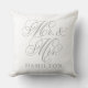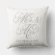 Elégant coussin d'accent carré pour les couples heureux et les jeunes mariés dispose d'un script gris d'étain M et Mme design avec un texte monogramme personnalisé qui peut être personnalisé avec le nom de famille marié. La couleur blanche de l'arrière - plan peut être customisée en harmonie avec les couleurs de la maison ou de la chambre.