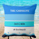 Personalize this Stripes Beach House Throw Pillow, a perfect addition to elevate your Coastal retreat's decor. The pillow features a soothing palette of Light Blue, Dark Blue, and Crisp White Stripes that effortlessly evoke the breezy atmosphere of a beach house. A trendy Navy Blue wave design, reminiscent of the ebb and flow of the ocean along the coast adds a Chic touch. This Elegant throw pillow seamlessly blends the tranquility of the Ocean with a touch of Stylish sophistication. Also perfect as a Beach Housewarming gift.