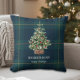 Personalized Christmas throw pillow featuring festive Christmas tree with classic navy and green tartan plaid design.