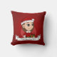 Jetez l'oreiller avec l'illustration d'une jolie fille souriante aux cheveux bruns longs, la fille porte un costume de Santa Clause avec casquette rouge et tenant un cadeau; dans un cercle rouge sur un arrière - plan rouge, avec modèle texte personnalisable pour votre nom ou message