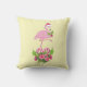 Un coussin avec un flamant de Noël à thème tropical portant un chapeau de santa rose. Sous ses pieds se trouve un bouquet de sucre de canne avec de jolies fleurs tropicales et des baies roses. Un bourgeon de saint sur sa poitrine.