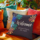 Cette jolie coussin à thème floral présente des motifs de marguerite colorés et un message d'accueil et familial établi pour vos visiteurs sur un arrière - plan sombre. C'est un design amusant, et vous pouvez faire un message personnalisé si vous souhaitez modifier le tapis à l'aide de l'outil de personnalisation dans la liste. A utiliser pour la décoration de porche ou sur une terrasse pour accueillir les clients.