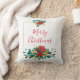Une coussin avec un joli bouquet fleuri dans les tons rouge, or et vert. Un cadre doré derrière les fleurs. Joyeux Noël écrit à l'intérieur.