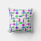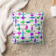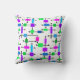 Cet oreiller de lancer a un design moderne du milieu du siècle d'une grille faite de lignes noires horizontales et verticales avec des rectangles dans différentes nuances vibrantes de vert, bleu et violet.
