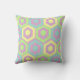 Cet oreiller de lancer a un design géométrique d'hexagones en bleu pâle, jaune pâle et vert pâle sur un champ de rayures en rose pâle et violet pâle.