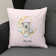 Ce coussin personnalisé présente un adorable koala bébé enroulé dormant sur une lune de croissant avec des étoiles brillantes sur un arrière - plan rose doux pastel fantaisiste.