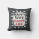 Le texte gras "Happy Wife Happy Life" est centré sur un arrière - plan gris. Le texte noir et rouge est posé sur un rectangle blanc avec de grands points blancs texturés autour, offrant un contraste ludique sur le fond de couleur solide.