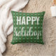 Coussin jeté à carreaux Joyeuses Fêtes. Feuilles de houx de plusieurs nuances de vert sur fond vert foncé dans un style à carreaux. Joyeuses Fêtes est en blanc dans deux polices. Pour un Noël rustique et classique !
