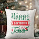 Joyeux Anniversaire Jésus jette l'oreiller dans des couleurs festives rouges et vertes de vacances avec une poussée d'accents de sainte et de flocon de neige.