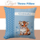 Lance double face oreiller / coussin pour la chambre d'un enfant / crèche / salle de jeu. Ce coussin bleu et blanc a des pois, des étoiles et un tigre mignon, que vous pouvez personnaliser avec un nom.