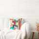 Cet oreiller de lancer a un design moderne du milieu du siècle de lignes et rectangles dans les tons rétro d'orange, or, canneberge, turquoise, vert, bleu, turquoise et vert.