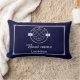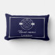 Lumbar nautique personnalisé Jetez l'oreiller avec le nom et l'emplacement du bateau et les symboles nautiques. Couleurs bleu marine et blanc. Fait un cadeau unique pour les propriétaires de bateaux.