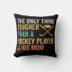 Thème de hockey jetez l'oreiller pour la maman de hockey avec la rondelle de hockey et bâtons avec le texte de blanc, or, aqua et melon qui lit La seule chose plus dure qu'un joueur de hockey est Sa maman!