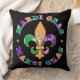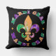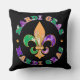 Un carré de Mardi Gras lance l'oreiller dans des couleurs vives en épelant le mot dans violet clair, vert et jaune