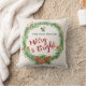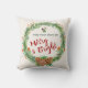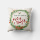Un coussin de Noël avec une couronne d'aquarelle. Seringues de pin vert, cônes de pin et baies décoratives composent cette couronne festive. À l'intérieur de la couronne sont quelques ornements décoratifs et les mots" mai vos jours être Joyeux et lumineux. Écrit dans une police rouge tendance.