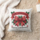 Custom double-sided throw pillow with your family name, the message "Merry Christmas", and a big red bow in the center with mistletoe, stars, and snowflakes on a white background.