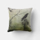Des corbeaux dans la brume verte d'un cimetière sur un coussin qui s'intégrerait bien dans une salle décorée de façon gothique. Un côté est légèrement différent de l'autre.