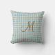 Oreiller jetable à carreaux bleu et tanné monogrammé avec votre initiale en brun. Fait un excellent cadeau ou rafraîchit votre propre maison.