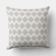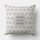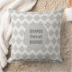 Beau motif en diamant géométrique gris sur un arrière - plan presque blanc. Le côté avant du coussin a un grand point gris avec le texte : Home Sweet Home.