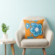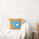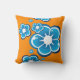 Coussin floral lumineux et coloré avec des fleurs bleues et un arrière - plan orange.