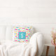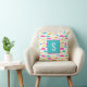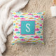 Coussin motif simple mais doux en aqua, rose, orange, jaune et vert menthe avec monogramme initial.