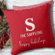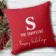 Personnalisez ce coussin tendance et élégant avec votre nom, monogramme et salut personnel. Design propose des informations personnalisées sur le devant d'un arrière - plan rouge classique avec des rayures de Noël à l'arrière du coussin pour ajouter une touche festive amusante de vacances. Ce coussin ajoute une élégante ambiance festive à votre décor de vacances. Facile à customiser tout le texte. Joyeuses fêtes !