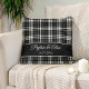 Housse de coussin élégante avec un motif carreauté de plaid/tartan buffle noir et blanc, personnalisée avec les noms d'un couple et la date de mariage ou tout texte de votre choix. Belle décoration de ferme.