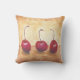Still life artwork done in oil pastels. 3 plump crimson red cherries sitting on a brown wooden table.