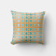 Cet oreiller de lancer a un design géométrique de lignes dans les tons turquoises et orange tressés pour faire un plaid.