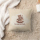 Un coussin avec l'illustration d'un jouet en bois : un ours en peluche souriant à cheval à bascule dans les tons chauds contre un arrière - plan doux et taché. L'ours porte un petit tablier d'artisan et tient un petit outil en bois. Une bonne idée cadeau pour une famille ou un enfant !