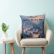 A cozy mountain village blanketed in snow, glowing windows, smoke rising from chimneys, and twinkling string lights along rooftops as the sun sets behind pine-covered hills.