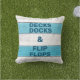 Ce coussin extérieur amusant est agrémenté de la citation, "Decks Docks and Flip Flops" sur un arrière - plan en bois blanc et bleu patiné, ce qui le rend parfait pour le bateau, le chalet, la maison de plage, le pont ou la piscine.