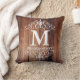 Obtenez un élégant, rustique, ferme chic look pour votre salon ou chambre à coucher avec cet oreiller à jetons personnalisé. Il a un arrière - plan de planches en bois brun foncé, des parchemins tourbillonnant blancs, des accents de cadrage haut et bas, ainsi que votre lettre monogramme personnalisée et le texte du nom de famille en blanc.