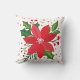 Un oreiller à jetons carré présente un design festif. La coussin est composée d'un arrière - plan blanc avec un motif de petits points éparpillés dans différentes tonalités de rouge et de rose. Centrée sur la coussin est une grande fleur de poinsettia rouge stylisée avec des pétales pointus. Le centre de la fleur est orné d'un amas de petits points blancs, ressemblant aux étamines de la fleur. Autour des poinsettia se trouvent des sprigs de feuilles verts saints avec des bords déchiquetés et des grappes de petites baies rouges. L'ensemble est simple et graphique, avec des couleurs plates et des lignes épurées, ce qui lui donne un aspect moderne et gai.