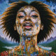 "L'âme dorée, le ciel infini". Une femme afro-moderne rayonnante entourée de détails dorés et cosmiques symbolise la force et la transcendance spirituelle. Mélange d'éléments abstraits et surréalistes, cette pièce exhale inspiration et positivité, avec le sourire de la femme qui représente l'espoir, et la force intérieure pour un avenir plus radieux et plus uni.