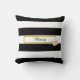 Chic jeté de coussin rayé noir et blanc élégant avec un joli nom en script noir encadré d'or et une rose de pêche estivale dans le coin. Vous pouvez personnaliser le nom dans un texte élégant et changer les couleurs, ce qui en fait un cadeau idéal pour vous-même ou pour un ami ou un membre de la famille.