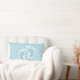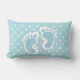 Un coussin lombaire avec une charmante image des empreintes de bébé bleu avec un contour blanc épais. Pois blancs sur un arrière - plan bleu bébé derrière l'illustration.