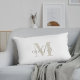Coussin lombaire moderne sur mesure avec monogramme personnalisé et nom de famille en calligraphie moderne imprimée sur le devant, chèque en bison beige/plaid/motif en vichy sur le dos.