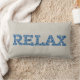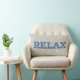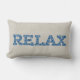 Un coussin lombaire amusant avec le mot "RELAX" en lettres remplies d'un motif floral bleu et vert sur un arrière - plan de couleur hessienne (burlap).