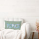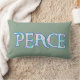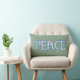 Un très joli coussin lombaire avec le mot 'PEACE' dans un script rempli d'un joli motif rose et bleu floral souligné sur un arrière - plan vert tendre.