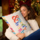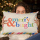 Jolie typographie et rayé coussin de vacances accent. Les principales caractéristiques comprennent le sentiment "Joyeux & Lumineux" dans de grandes lettres multicolores sur un arrière - plan neutre et une bordure rayée dans les couleurs correspondant aux lettres. Back continue le motif de bande. Coussin avec un accent amusant et dynamique avec un sentiment de vacances populaire. Parfait pour votre décoration de vacances et fait un grand cadeau. Santé!