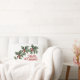 Oreiller décoratif avec texte Joyeux Noël et une branche verte de Saint-Arbre avec baies rouges.