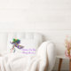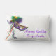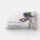 coussin lombaire blanc de 13 po x 21 po avec l'image, de part et d'autre, d'un beau masque satin violet, vert et or sur un bâton avec des plumes et des rubans coordonnés, et le texte "Laissez Les Bon Temps Rouler", en écriture violette. Voir toute la collection de Coussins Mardi Gras dans le DECOR | section Coussin.