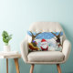Scène de Noël hivernale. Un jour d'hiver enneigé avec un père Noël joyeux avec son traîneau plein de cadeaux. A droite un bonhomme de neige heureux en foulard et chapeau en haut qui attend de voir ce que père Noël lui a apporté.