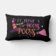 Cute Fun Pastel Witch Hocus Pocus Halloween Casquette Broomstick Lumbar Coussin, Bienvenue à vos invités avec ce joli éffrayant et drôle Lumbar Coussin Halloween. Le design stylisé de la typographie comprend "C'est juste un tas de Hocus Pocus" libellé jaune, violet et rose pastel, orange, bâton de départ et sorcière, casquette sorcier, en arrière - plan noir.