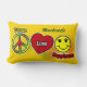This Peace, Love & Happiness lumbar pillow features playful peace, heart, and smiley icons set on a warm golden yellow background. The green script name detail in the upper-right adds a signature touch while keeping the design balanced and light.