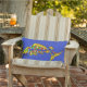 Ce coussin extérieur pour votre décor de maison a un arrière - plan bleu foncé vibrant avec de minuscules éclaboussures blanches comme des éclaboussures avec un grand poisson pop art abstrait brillant avec des écailles colorées en orange, jaune et blues.